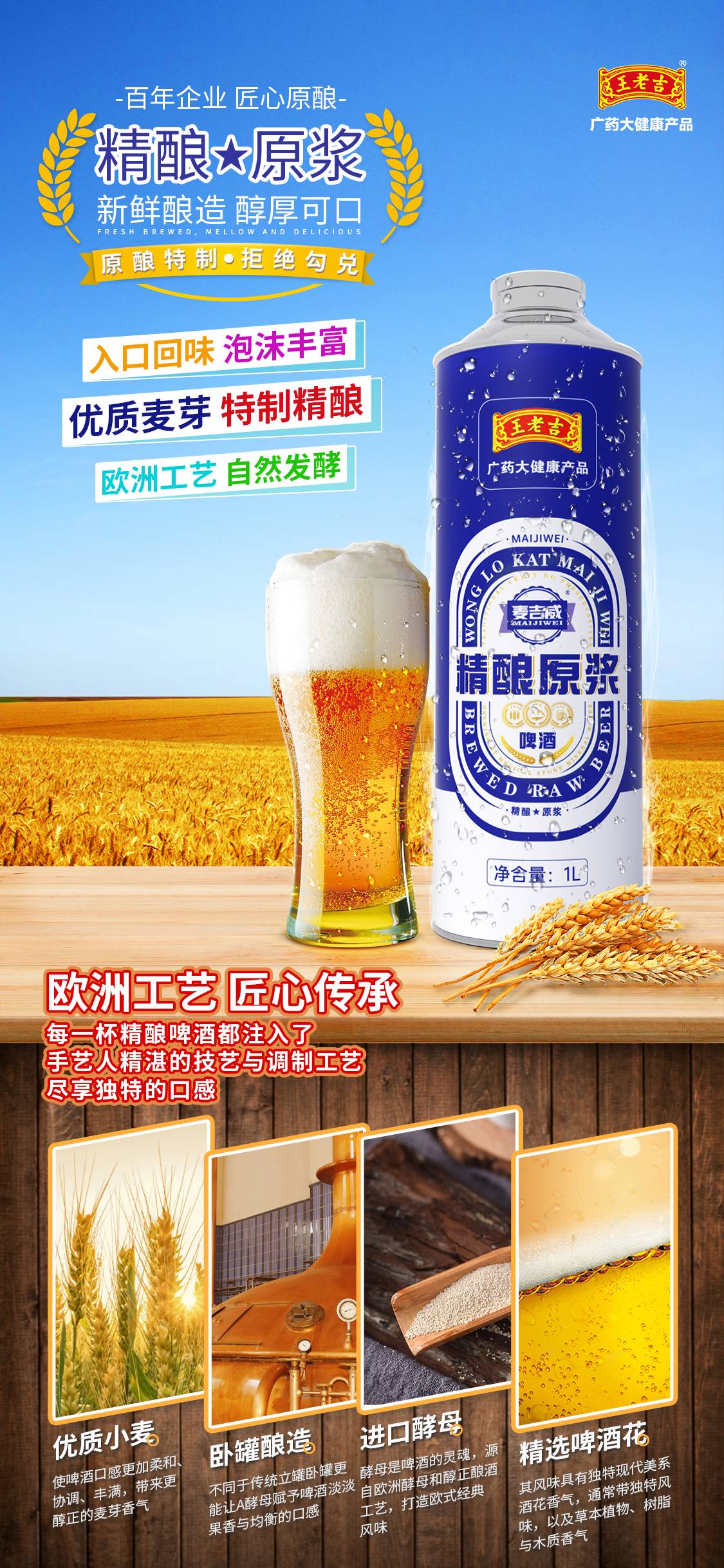 而且王老吉麦吉威啤酒是一款纯原浆精酿的啤酒,采用地下300米深的无污染无杂质的水,澳大利亚进口麦芽,捷克纯进口酒花,确保酿造出来的啤酒清澈甘甜,芳香馥郁并且拥有细腻丰富的泡沫。王老吉麦吉威啤酒抛弃了大多数啤酒品牌使用的工业酿造手法,选用原浆精酿啤酒,利用艾尔工艺,不低于45天的酿造时间,酿造出富含活性酵母的啤酒。这让王老吉麦吉威啤酒既具有传统的啤酒风格,又同时延续王老吉的“健康”传统